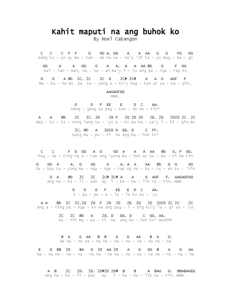 High quality sheet music for Kahit Maputi Na Ang Buhok Ko. C D G G7 papaalala ko sayo C F7 Bm E Ang aking pangako na ang pag-ibig koy lagi sayo Am D G Kahit maputi na ang buhok ko BmG AmG D G x2. You Are My Sunshine Kalimba Sheet and Tabs January 29 2021.